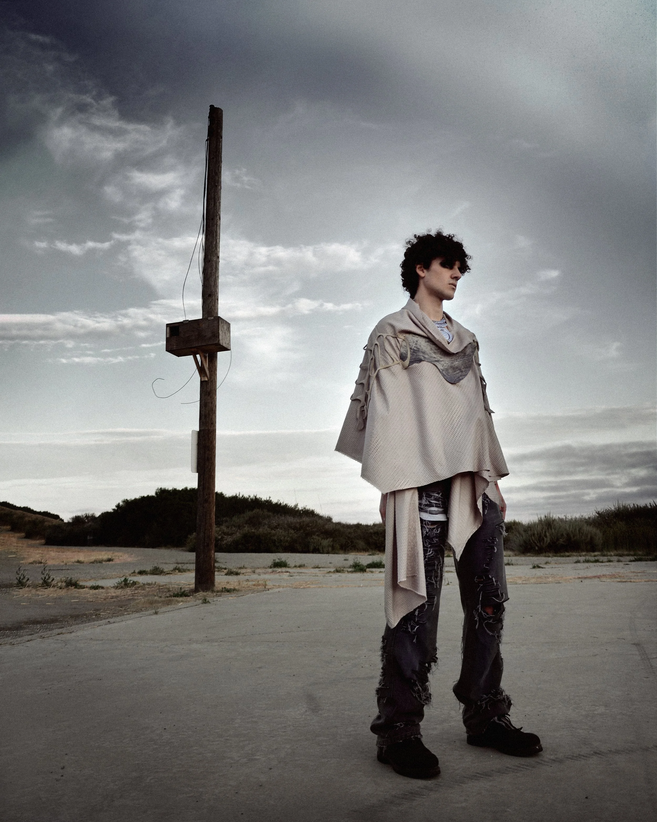 distressed knit and asymmetrical woven tunicn top with raw denim arm sleeves and distressed denim pants