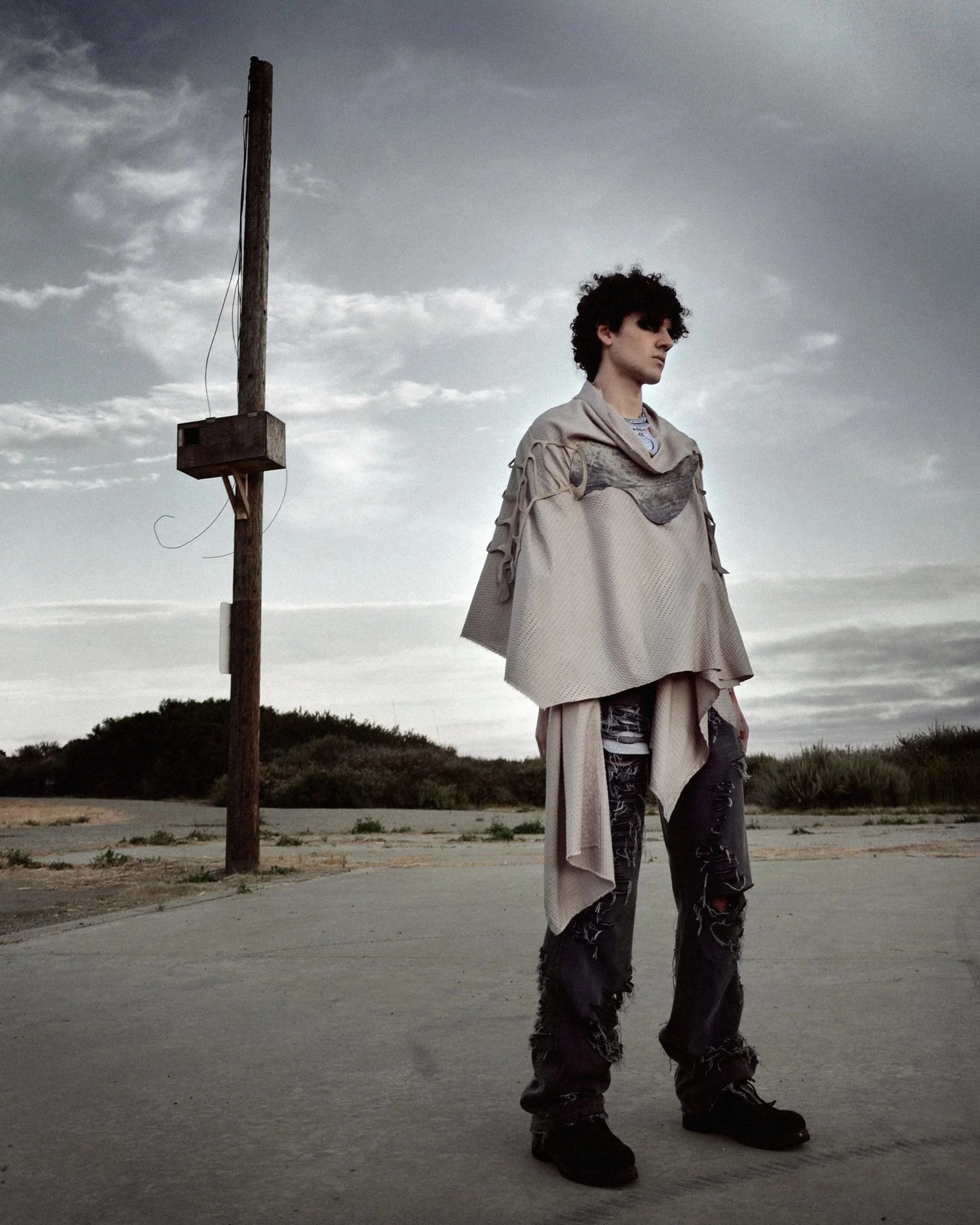 DISTRESSED and dip dyed off the shoulder long sleeve, paired with capris manipulated at side seam and inseams with elastic hem. 100% recycled materials